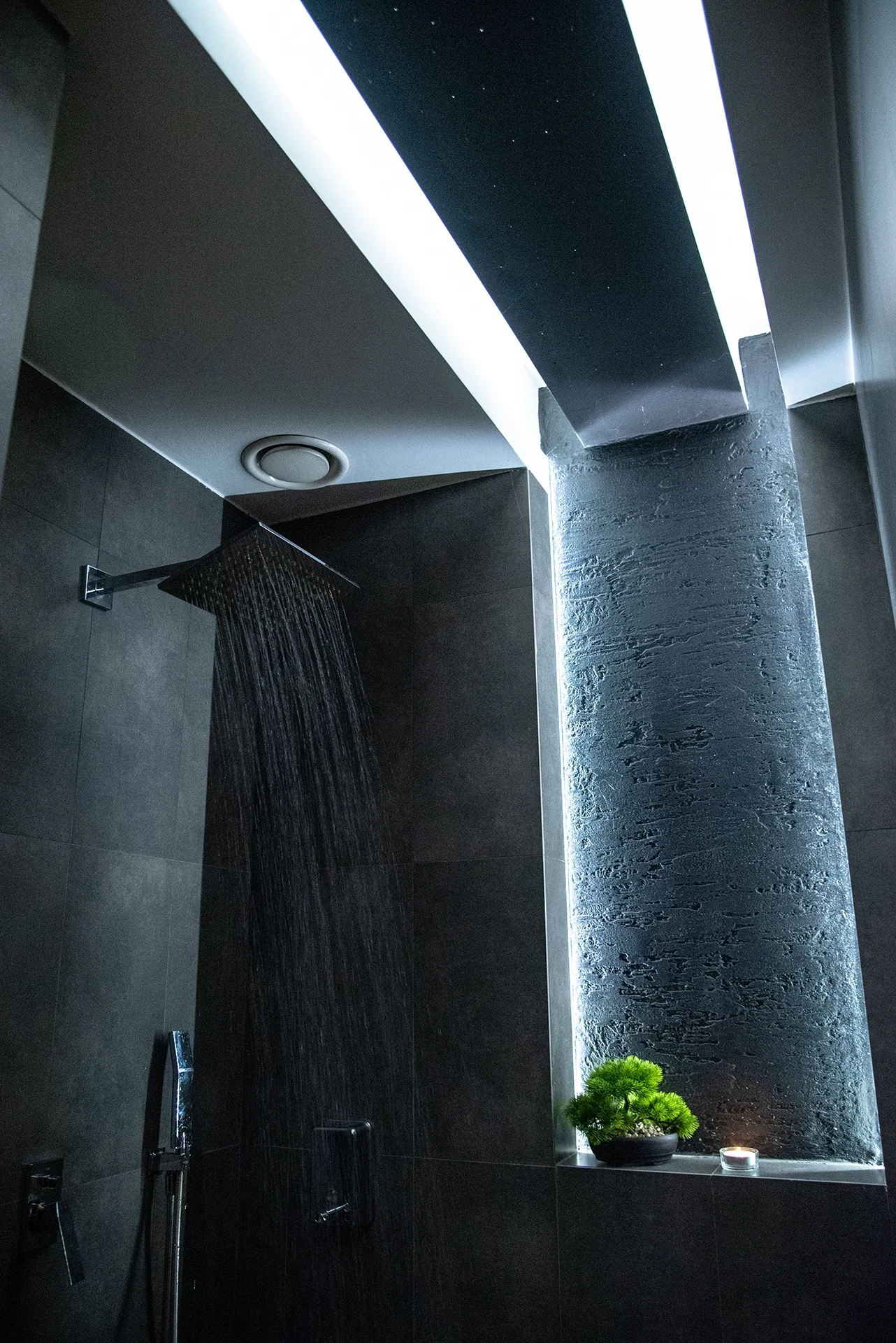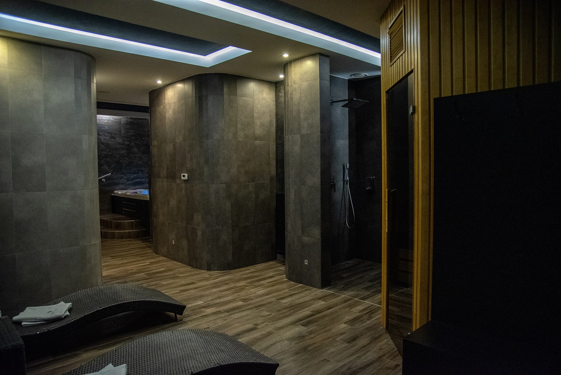 Součástí prostoru je také sprcha a sauna, které doplňují celkový wellness zážitek a umožňují střídání teplot pro maximální efekt relaxace.