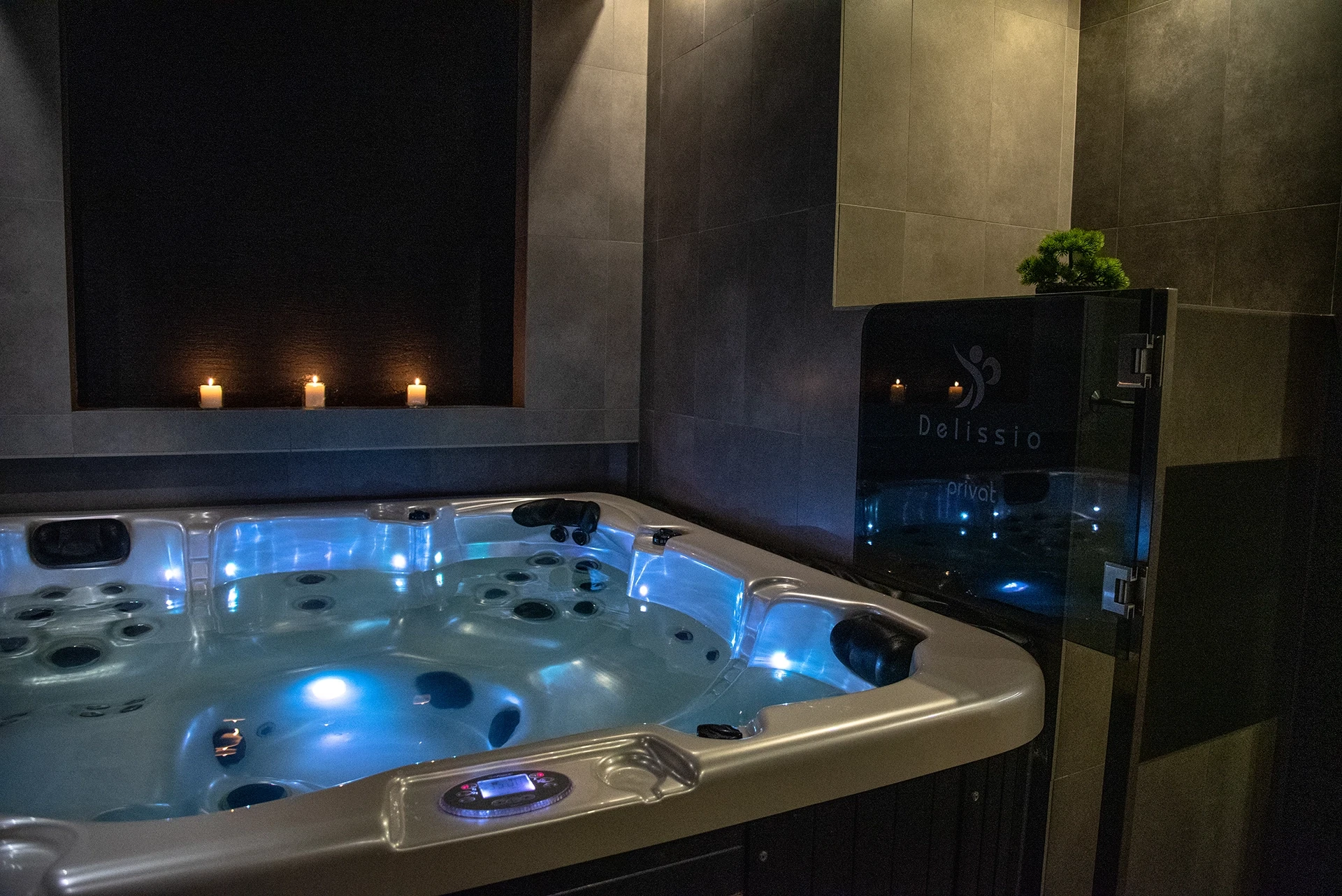 Moderně laděný interiér kombinuje přírodní materiály s tlumeným osvětlením, které vytváří příjemnou a klidnou atmosféru pro odpočinek. Vířivá vana poskytuje dokonalé uvolnění po náročném dni. Kombinace teplé vody a masážních trysek pomáhá regeneraci těla i mysli.